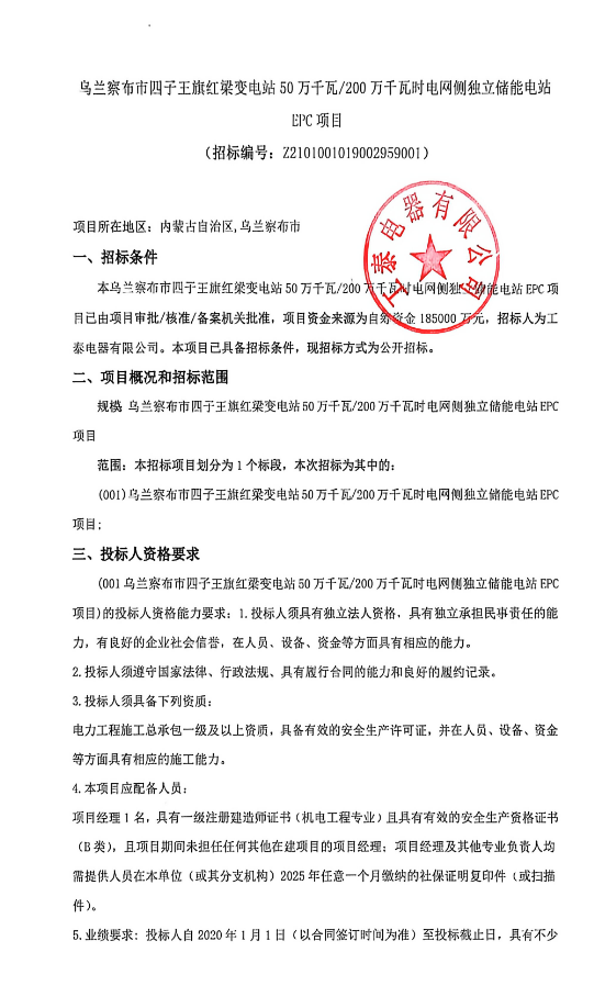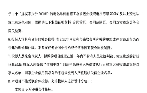 要求投標(biāo)人自2020年1月1日(以合同簽訂時(shí)間為準(zhǔn))至投標(biāo)止日,具有不少于1個(gè)(規(guī)模不少于200MW)的電化學(xué)儲(chǔ)能施工總承包業(yè)績(jī)或電壓等級(jí)220kV及以上變電站施工總承包業(yè)績(jī)。