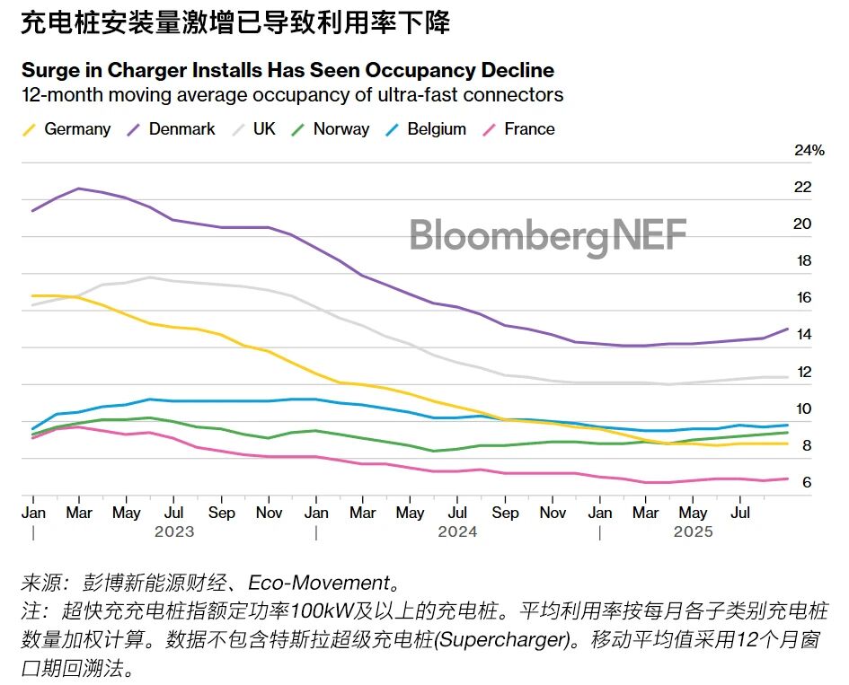 歐洲主要市場(chǎng)的充電樁利用率(即充電樁連接車輛的時(shí)長(zhǎng))普遍下降,超快充充電樁尤為顯著。安裝量激增導(dǎo)致了這一下滑,超快充網(wǎng)絡(luò)的擴(kuò)張速度已超過新能源汽車保有量增速。