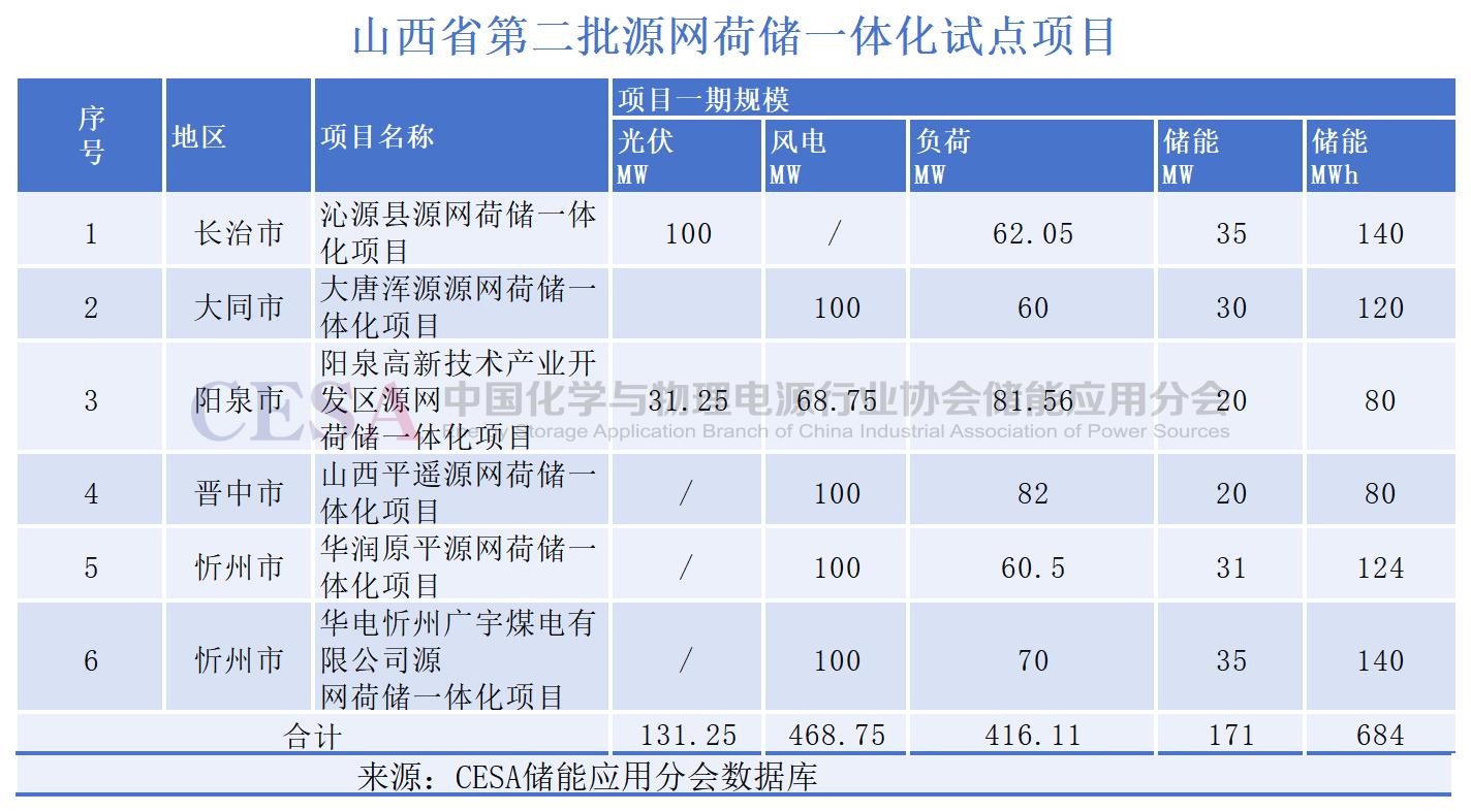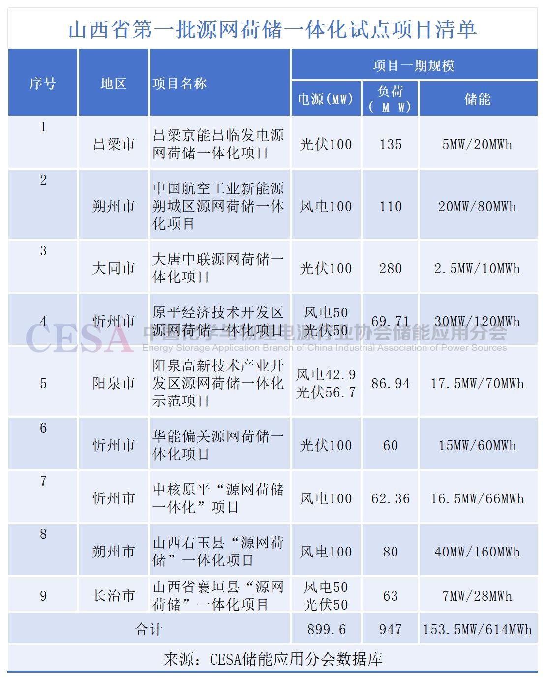 2023年6月,山西省公布了第一批源網(wǎng)荷儲(chǔ)一體化試點(diǎn)項(xiàng)目清單,包含9個(gè)項(xiàng)目,配置儲(chǔ)能153.5MW/614MWh。第一批項(xiàng)目新能源裝機(jī)規(guī)模899.6MW,負(fù)荷規(guī)模947MW。