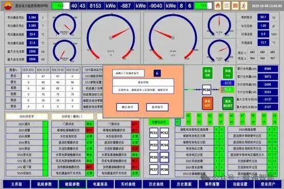 PCS 與 BMS 數(shù)據(jù):包括兩臺(tái)PCS 和 BMS 的運(yùn)行狀態(tài)、電池箱總電壓和總電流、電池箱單體的最高溫度、最低溫度、最高單體電壓、最低單體電壓、電池箱累計(jì)充放電量以及有功和無功期望值,還顯示了兩臺(tái) ESS 實(shí)時(shí)功率值、SOC值、SOH 值.