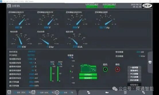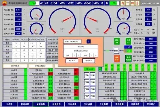【儲(chǔ)能參數(shù)】監(jiān)控畫面, 查看儲(chǔ)能運(yùn)行的儀表監(jiān)控、功率比值、故障報(bào)警等詳細(xì)信息。