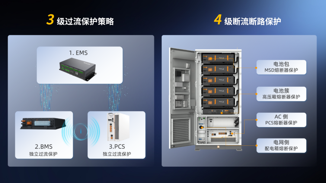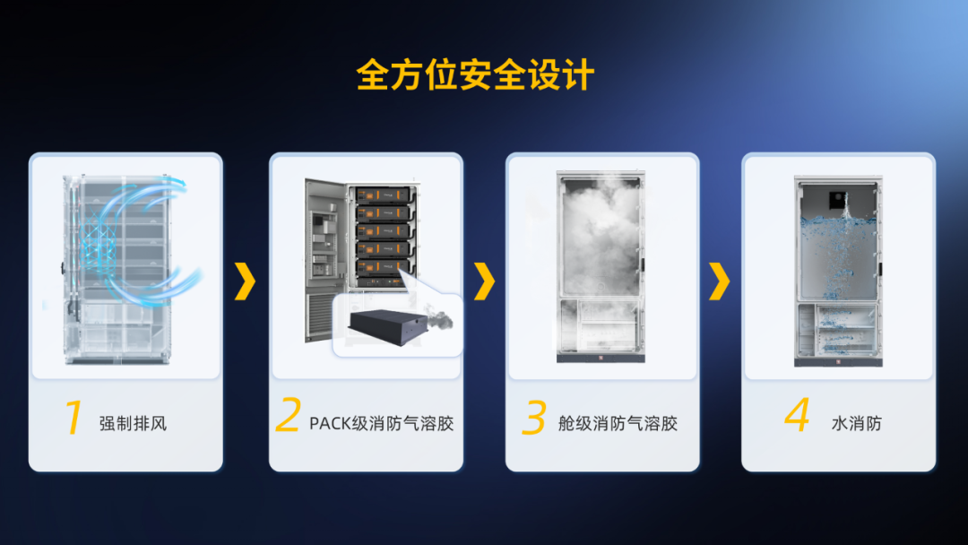 02 設(shè)備安全:通過多重消防過盈設(shè)計,從電芯、模組到機柜,全方位配置配置煙感、溫感、可燃?xì)怏w、水浸等多重傳感器,并預(yù)留消防接口,有效預(yù)防和應(yīng)對突發(fā)情況。