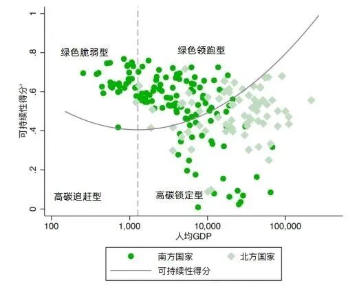 研究發(fā)現(xiàn),可持續(xù)性與經(jīng)濟(jì)發(fā)展呈現(xiàn)“U型”關(guān)系。當(dāng)經(jīng)濟(jì)發(fā)展跨越人均GDP約為1254美元水平的關(guān)鍵拐點(diǎn)后,一國(guó)可續(xù)性維度在經(jīng)歷谷底后開始穩(wěn)步回升,經(jīng)濟(jì)增長(zhǎng)逐漸與碳排放“脫鉤”?;谶@條U型曲線以及各國(guó)當(dāng)前可持續(xù)性的實(shí)際表現(xiàn),可以將全球國(guó)家劃分為四種不同的發(fā)展路徑類型,即綠色脆弱型經(jīng)濟(jì)體、高碳鎖定型經(jīng)濟(jì)體、綠色領(lǐng)跑型經(jīng)濟(jì)體、高碳追趕型經(jīng)濟(jì)體。