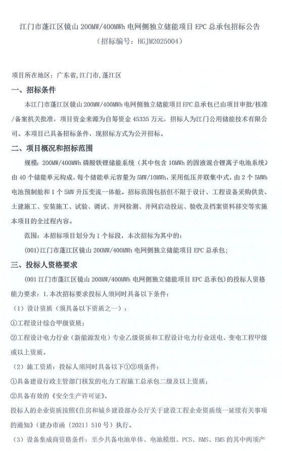 中國儲(chǔ)能網(wǎng)訊:11月10日,江門公用儲(chǔ)能技術(shù)有限公司發(fā)布江門市蓬江區(qū)鏡山200MW/400MWh電網(wǎng)側(cè)獨(dú)立儲(chǔ)能項(xiàng)目EPC總承包招標(biāo)公告。項(xiàng)目位于廣東省江門市蓬江區(qū),項(xiàng)目規(guī)模為200MW/400MWh,采用磷酸鐵鋰儲(chǔ)能系統(tǒng)(其中包含10MWh的固液混合鋰離子電池系統(tǒng)),由40個(gè)儲(chǔ)能單元構(gòu)成,每個(gè)儲(chǔ)能單元容量為5MW/10MWh,采用低壓并聯(lián)集中式,由2個(gè)5MWh電池預(yù)制艙和1個(gè)5MW 升壓變流一體艙。招標(biāo)范圍包括但不限于設(shè)計(jì)、工程設(shè)備采購供貨、土建施工、安裝施工、試驗(yàn)、調(diào)試、并網(wǎng)檢測、并網(wǎng)啟動(dòng)投運(yùn)、驗(yàn)收及檔案資料移交等實(shí)施本項(xiàng)目的全過程內(nèi)容。