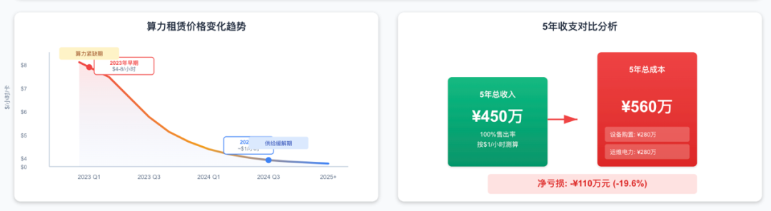 然而隨著2024年供給緩解、算力租賃價格下滑,中期租價降至每卡僅1美元/小時左右,按100%售出率測算5年總收入約¥450萬,扣除設(shè)備與機房等成本(約¥560萬,含服務(wù)器購置和5年運維電力等附加成本,五年反而虧損約¥110萬。直線折舊法下前兩年盈利、第三年開始虧損的現(xiàn)象表明:GPU資產(chǎn)的經(jīng)濟壽命通常小于賬面折舊年限。