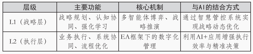雙層聯(lián)動(dòng)是在傳統(tǒng)企業(yè)架構(gòu)框架基礎(chǔ)上,嵌入智慧管控系統(tǒng)理念,形成L1(戰(zhàn)略學(xué)習(xí)層)與L2(執(zhí)行實(shí)施層)的雙層結(jié)構(gòu),使戰(zhàn)略規(guī)劃、業(yè)務(wù)執(zhí)行與認(rèn)知反饋能夠形成強(qiáng)化學(xué)習(xí)循環(huán)。