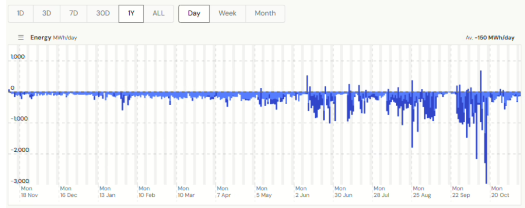 當(dāng)前運(yùn)行:10 月中旬完成滿出力測(cè)試后,站點(diǎn)能量活動(dòng)明顯回落;10 月 10 日實(shí)現(xiàn)首次整站完全放電,10 月 17 日充放電合計(jì)峰值 2,774 MWh。目前以約 350 MW 規(guī)模部分運(yùn)行(推測(cè)依賴(lài)剩余完好的主變)。