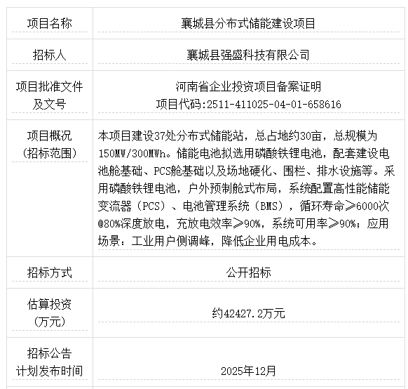 項目招標(biāo)人為襄城縣強盛科技有限公司,本項目建設(shè)37處分布式儲能站,總占地約30畝,總規(guī)模為150MW/300MWh。儲能電池擬選用磷酸鐵鋰電池,配套建設(shè)電池艙基礎(chǔ)、PCS艙基礎(chǔ)以及場地硬化、圍欄、排水設(shè)施等。采用磷酸鐵鋰電池,戶外預(yù)制艙式布局,系統(tǒng)配置高性能儲能變流器(PCS)、電池管理系統(tǒng)(BMS),循環(huán)壽命≥6000次@80%深度放電,充放電效率≥90%,系統(tǒng)可用率≥90%;應(yīng)用場景:工業(yè)用戶側(cè)調(diào)峰,降低企業(yè)用電成本。
