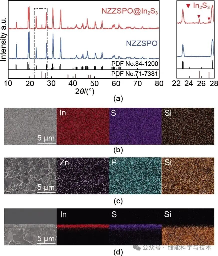 圖1 (a) NZZSPO和NZZSPO@In2S3固體電解質(zhì)的XRD圖譜;(b) NZZSPO@In2S3和 (c) NZZSPO固體電解質(zhì)表面的SEM圖像和元素分布圖;(d) NZZSPO固體電解質(zhì)截面的SEM圖像和元素分布圖