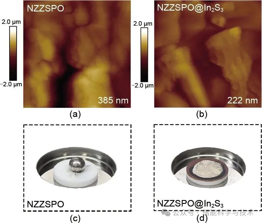 圖2 (a) NZZSPO和 (b) NZZSPO@In2S3固體電解質(zhì)的AFM圖像;熔融鈉在 (c) NZZSPO和 (d) NZZSPO@In2S3固體電解質(zhì)表面的潤濕性