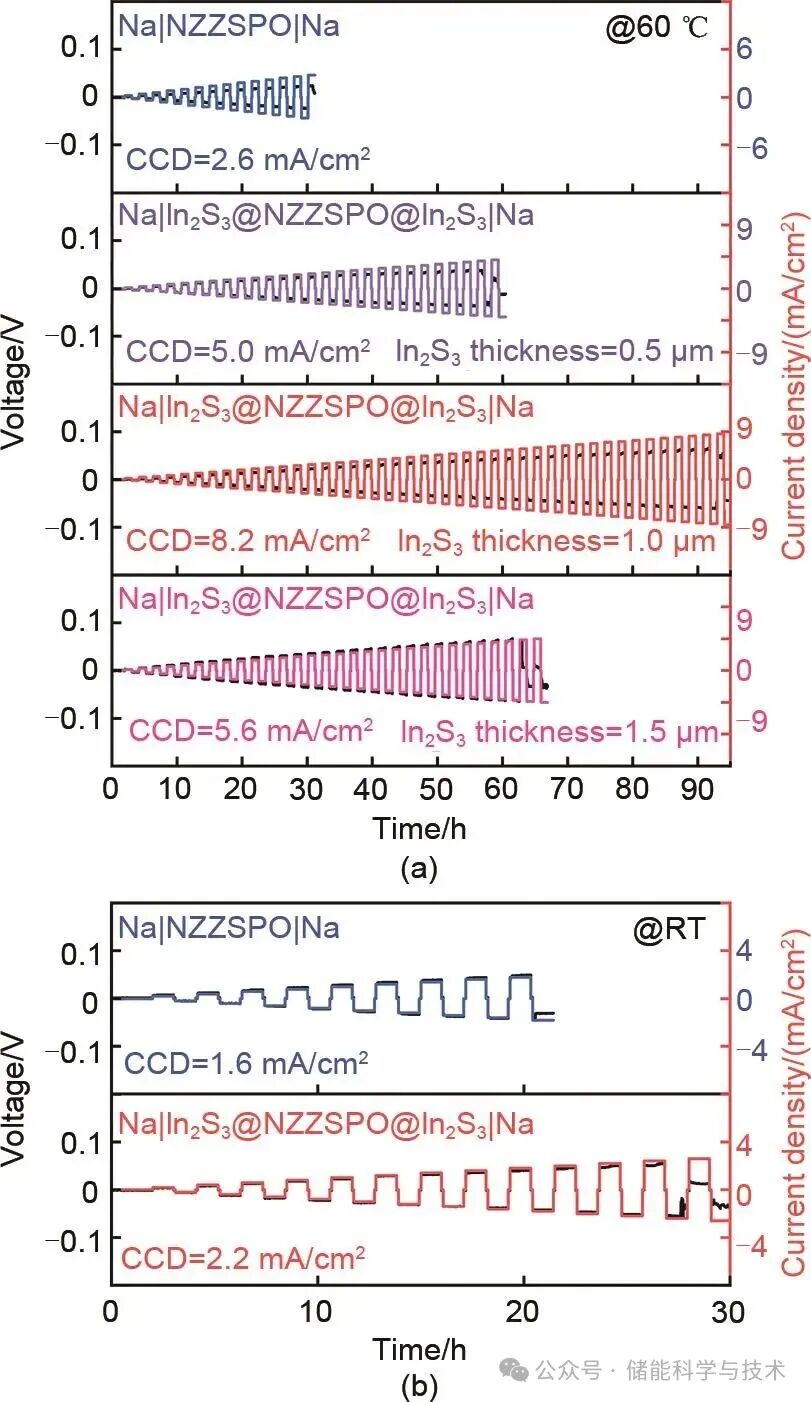 將鈉箔貼附在NZZSPO和NZZSPO@In2S3固體電解質(zhì)的兩側(cè),并在50 MPa的等靜壓下壓制得到對稱電池。為了測量臨界電流密度(CCD),這些電池在LAND CT-2001A電池測試系統(tǒng)上以逐步增加的電流密度進行循環(huán)測試。通過對稱電池在不同溫度和電流密度下的恒流充放電循環(huán),評估其長循環(huán)穩(wěn)定性。