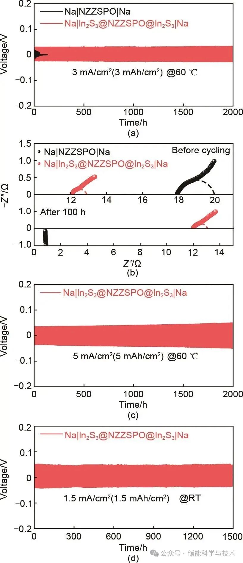 圖5 (a) Na|NZZSPO|Na和Na|In2S3@NZZSPO@In2S3 |Na對稱電池在60 ℃、3 mA/cm2下的恒流循環(huán)性能;(b) Na|NZZSPO|Na和Na|In2S3@NZZSPO@In2S3|Na對稱電池在60 ℃下循環(huán)100小時前后的阻抗譜圖;Na|In2S3 @NZZSPO@In2S3|Na對稱電池在 (c) 60 ℃、5 mA/cm2和 (d) 室溫、1.5 mA/cm2下的恒流循環(huán)性能