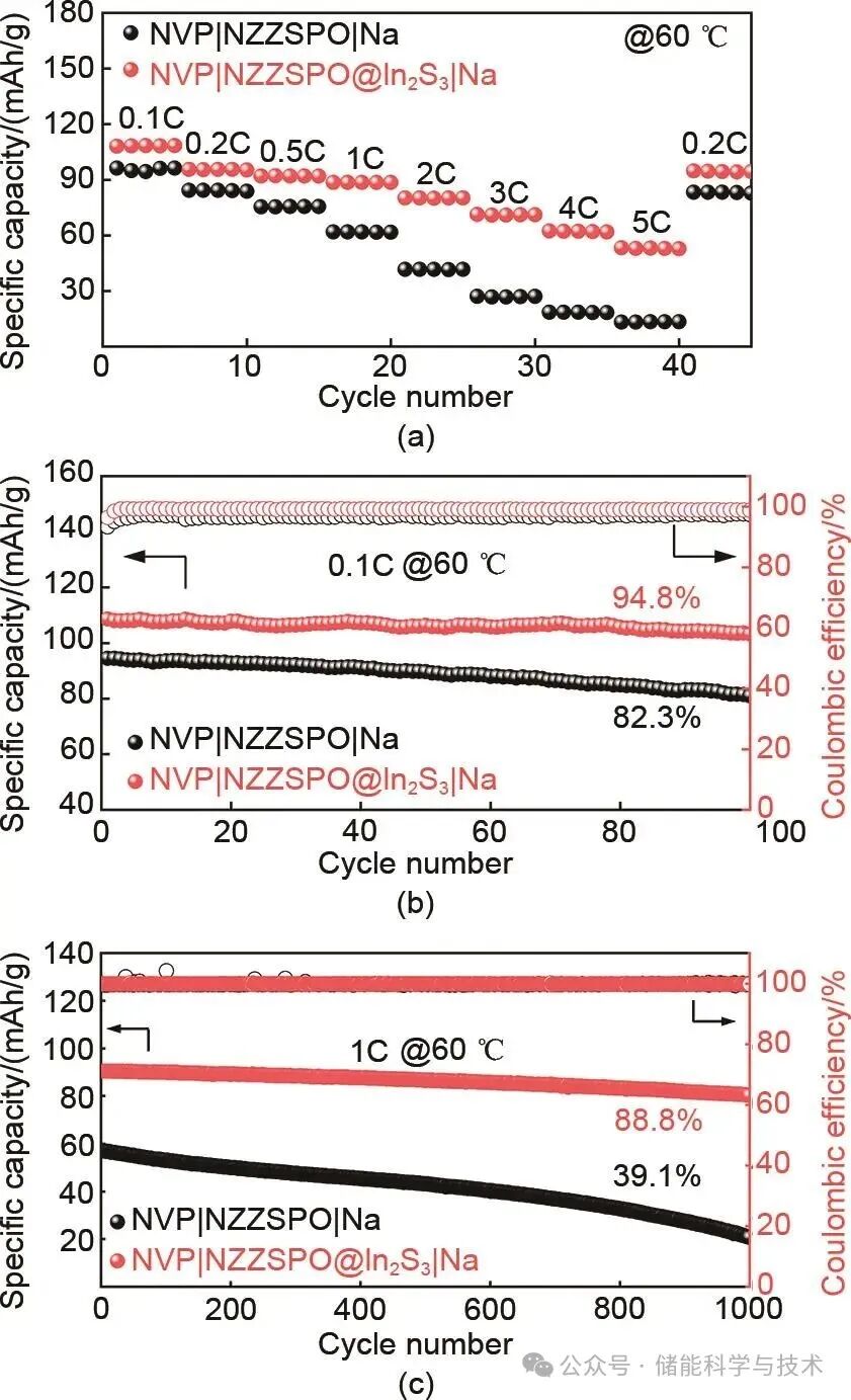 圖6 (a) NVP|NZZSPO|Na和NVP|NZZSPO@In2S3|Na全固態(tài)電池在60 ℃下的倍率性能;60 ℃下,NVP|NZZSPO|Na和NVP|NZZSPO@In2S3|Na全固態(tài)電池在 (b) 0.1C和 (c) 1C下的長循環(huán)性能