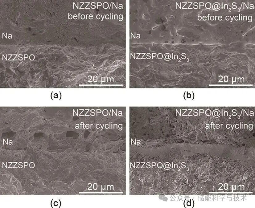 圖7 循環(huán)前后的 (a),(c) NZZSPO和 (b),(d) NZZSPO@In2S3固體電解質(zhì)負極側(cè)的橫截面SEM圖像
