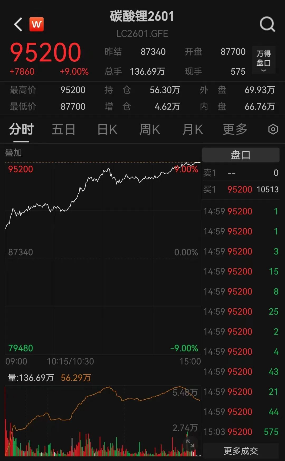 11月17日,碳酸鋰期貨主力合約持續(xù)走高,截至收盤,該主力合約漲停,報(bào)95200元/噸,創(chuàng)2024年7月以來新高。
