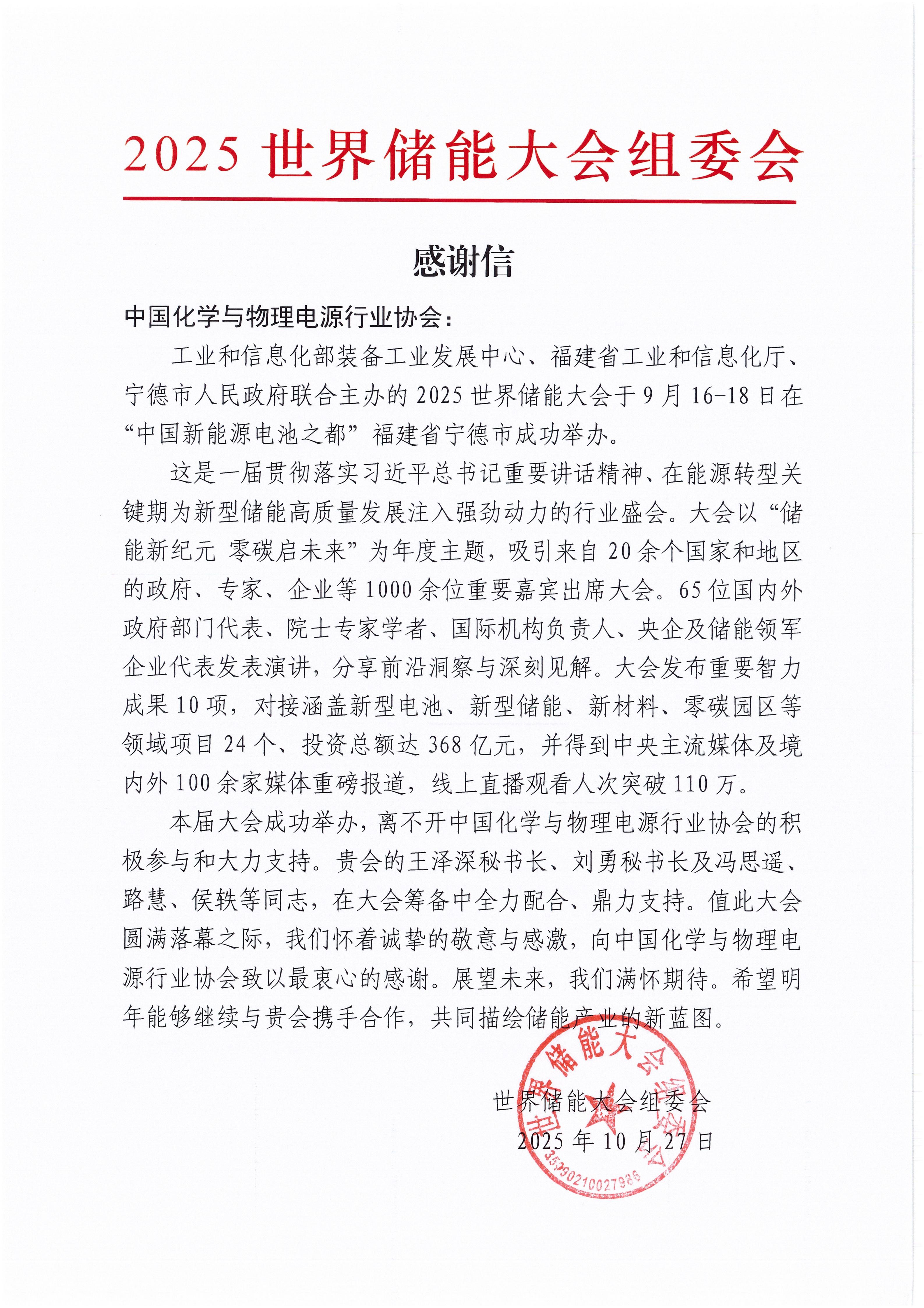 “值此大會圓滿落幕之際,我們懷著誠摯的敬意與感激,向中國化學(xué)與物理電源行業(yè)協(xié)會致以最衷心的感謝。”感謝信表示,希望明年能夠繼續(xù)與貴會攜手合作,共同描繪儲能產(chǎn)業(yè)的新藍(lán)圖。