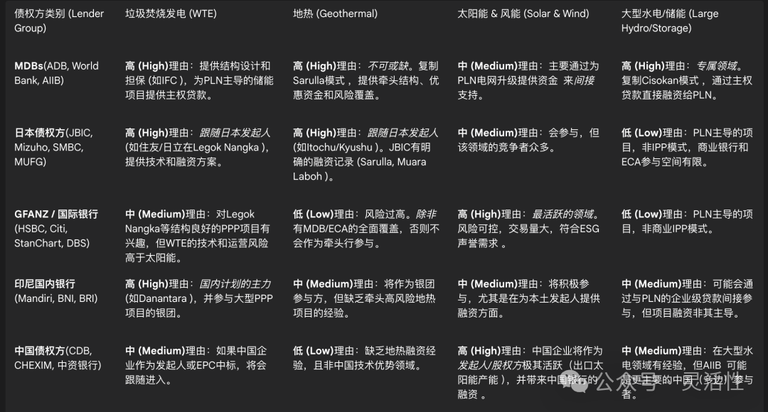 推斷: 亞洲開發(fā)銀行 (ADB) 和 世界銀行 (World Bank)。它們的角色是催化。它們在貸款總量上可能不是最大的,但卻是最關(guān)鍵的。它們正在資助使RUPTL成為可能的電網(wǎng)升級 4 和儲能項目 6,并且是高風(fēng)險地?zé)犴椖?22 的首席結(jié)構(gòu)設(shè)計師。沒有它們的前期介入和風(fēng)險緩釋,私營部門的萬億投資將無法進入。