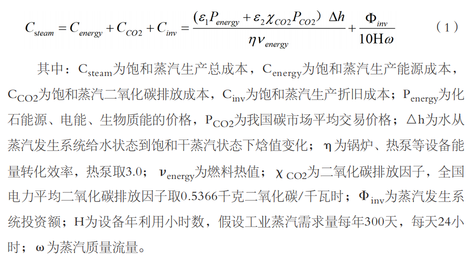 根據(jù)我國城市供熱價(jià)格管理相關(guān)規(guī)定,供熱成本是指供熱過程中發(fā)生的燃料費(fèi)、電費(fèi)、水費(fèi)、資產(chǎn)折舊費(fèi)、修理費(fèi)、工資以及其他應(yīng)計(jì)入供熱成本的直接費(fèi)用。由于本文側(cè)重分析不同技術(shù)路徑之間的成本對(duì)比,為簡化分析,供熱成本計(jì)算時(shí)只考慮涉及能源成本和投資強(qiáng)度的成本項(xiàng)。同時(shí),考慮到不同能源碳排放強(qiáng)度不同,碳排放成本作為蒸汽成本之一。