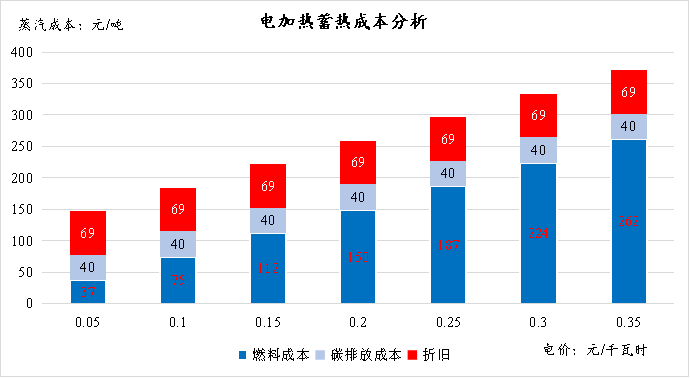 對(duì)于電加熱蓄熱系統(tǒng)而言,由于系統(tǒng)初始投資較大,折舊成本達(dá)到69元/噸,相當(dāng)于0.09元/千瓦時(shí)的能源成本,在蒸汽成本構(gòu)成中占比較高。在碳排放成本方面,采用全國電力平均二氧化碳排放因子,對(duì)于每噸蒸汽而言,對(duì)應(yīng)的碳排放量為0.4噸二氧化碳,分別是燃煤和燃?xì)獾?.6倍、2.7倍,可見在目前全國電力平均二氧化碳排放強(qiáng)度下,采用電加熱蓄熱方式蒸汽的碳排放強(qiáng)度顯著高于燃煤和燃?xì)?,只有?dāng)電力二氧化碳排放強(qiáng)度降低到0.2千克/千瓦時(shí)以下時(shí)(即電網(wǎng)碳排放因子再降低63%以上時(shí)),電供熱碳排放強(qiáng)度才與天然氣供熱碳排放強(qiáng)度相當(dāng)。