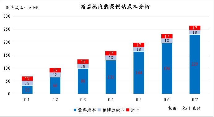對(duì)于高溫蒸汽熱泵系統(tǒng)供工業(yè)蒸汽而言,由于熱泵電熱性能系數(shù)較高,生產(chǎn)單位蒸汽耗電量約等于電鍋爐耗電量/COP,相應(yīng)地,蒸汽的直接能源成本和碳排放成本都顯著下降,在相同電價(jià)水平下,蒸汽熱泵系統(tǒng)均具有更好的經(jīng)濟(jì)性。