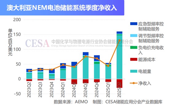 AEMO數(shù)據(jù)顯示,2025年二季度,澳大利亞能源套利凈收入大幅增長(zhǎng)至1.208億美元,同比增長(zhǎng)9550萬(wàn)美元(+377%),占總凈收入的93%。能源放電收入預(yù)計(jì)達(dá)到1.481億美元,同比增長(zhǎng)1.076億美元(+266%)。能源成本(收費(fèi)高于0美元/兆瓦時(shí))增加了1330萬(wàn)美元(+80%),達(dá)到2980萬(wàn)美元,而負(fù)電價(jià)充電收入增加了120萬(wàn)美元(+84%),達(dá)到260萬(wàn)美元。