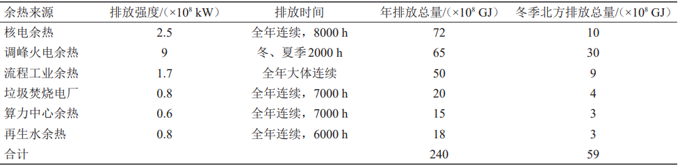 在更多的工業(yè)生產(chǎn)過程中,熱量排放過程過于分散而難以有效回收利用,需要外界提供足夠的余熱資源。當(dāng)然,也有很多工業(yè)過程排放大量的低品位余熱且遠(yuǎn)大于用熱需求。預(yù)測(cè)我國(guó)未來的余熱資源,沿海地區(qū)將建設(shè)裝機(jī)容量約為2×108 kW的核電站,核能反應(yīng)堆釋放的熱量中僅有40%轉(zhuǎn)換為電力,而約60%作為余熱通過海水冷卻排放,僅此每年可提供7×109 GJ以上的熱量。將保留裝機(jī)容量約為7×108 kW的火電,每年運(yùn)行約2000 h,發(fā)電1.5×1012 kW·h,這些火電廠在發(fā)電的同時(shí)也將排放約6.5×109 GJ的熱量。此外,冶金、有色、化工、建材等流程工業(yè),算力中心,垃圾焚燒廠,電網(wǎng)大型變壓器,污水處理后得到的中水等,都可釋放出大量余熱。整體上,我國(guó)每年約有2.4×1010 GJ的人類活動(dòng)排放余熱(見表1)。采用熱泵技術(shù)、COP平均值為3時(shí),只要回收余熱總量的40%(9×109 GJ)即可滿足需求?;厥崭黝愑酂岵⑼ㄟ^管網(wǎng)匯集,輸送到需要用熱的工業(yè)生產(chǎn)、建筑終端,在各個(gè)終端根據(jù)具體的用熱需求,通過熱泵制備成適宜參數(shù)的熱量,據(jù)此構(gòu)成余熱共享系統(tǒng),解決建筑采暖和工業(yè)用熱的高密度用熱需求(1.3×1010 GJ)。