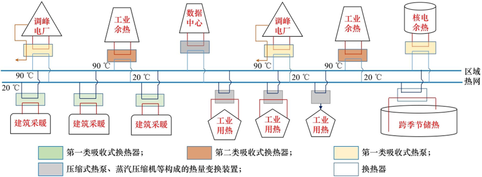 由統(tǒng)一的熱量輸配管網(wǎng)匯集各類余熱熱源的熱量,而各類余熱熱源產(chǎn)出熱量的溫度不盡相同,需要通過熱量變換裝置將熱源輸出的溫度變換到統(tǒng)一的參數(shù)。各類用熱用戶的狀況不同,返回到輸熱循環(huán)管網(wǎng)的回水溫度也不同,需要采用熱量變換裝置進(jìn)行參數(shù)變換,使各類用熱用戶返回到主管網(wǎng)回水的溫度保持統(tǒng)一。熱量變換裝置的作用類似電力輸配系統(tǒng)中的變壓器(解決源、網(wǎng)、荷對(duì)電壓的不同需求),支持熱量在不同溫度、不同狀態(tài)之間的有效傳遞。