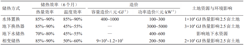 近年來,大規(guī)模儲(chǔ)熱是國(guó)際性研究熱點(diǎn)。儲(chǔ)熱可促進(jìn)供熱和供冷的用電需求與可再生能源發(fā)電之間的匹配性,有助于平衡電力季節(jié)性供需,支持向以可再生能源為主的能源系統(tǒng)的轉(zhuǎn)變。國(guó)內(nèi)外提出并實(shí)踐了多種跨季節(jié)儲(chǔ)熱技術(shù)路線。跨季節(jié)儲(chǔ)熱的方式主要有水體置換、地下?lián)Q熱器、地下水儲(chǔ)熱、相變儲(chǔ)熱,各種儲(chǔ)熱方式熱量效率差別不大,但溫度效率差別很大(見表3)。從熱量效率、溫度效率、造價(jià)、占地四方面綜合對(duì)比,水體置換儲(chǔ)熱在大多數(shù)場(chǎng)合都是優(yōu)選方式,也是迄今為止技術(shù)最成熟、應(yīng)用最廣泛的儲(chǔ)熱方式。