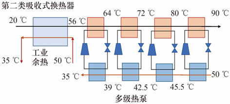 熱量變換器的熱量輸入源為循環(huán)水,如果熱量輸出側(cè)也是循環(huán)水,當(dāng)熱源側(cè)循環(huán)水的平均溫度高于熱匯側(cè)循環(huán)水平均溫度時(shí),可以通過吸收式換熱器實(shí)現(xiàn)這一換熱過程。在熱源與熱匯溫差明顯不匹配時(shí),吸收式換熱器可以使熱匯側(cè)獲得最高溫度,在滿足經(jīng)濟(jì)性的前提下實(shí)現(xiàn)兩側(cè)平均溫度差低至10 K條件時(shí)的熱量傳遞。當(dāng)兩側(cè)平均溫度差<10 K甚至熱匯側(cè)要求的平均溫度高于熱源側(cè)時(shí),需輔以壓縮式熱泵并輸入電力做功以提高熱匯側(cè)的溫度品位。從50/35 ℃的余熱中提取熱量到90/20 ℃的余熱共享循環(huán)水系統(tǒng)中的流程如圖2所示。