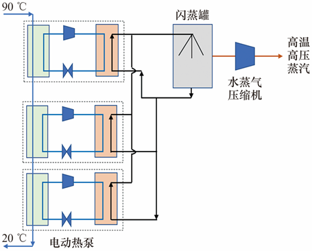 在多數(shù)情景下,工業(yè)生產(chǎn)需要的熱量以蒸汽形式提供,可從90/20 ℃的循環(huán)水中提熱量,通過吸收式換熱器、電動(dòng)熱泵聯(lián)合工作將熱量變換成為高溫水,再通過閃蒸得到低壓蒸汽,經(jīng)過水蒸氣壓縮機(jī)將低壓蒸汽壓縮至所需壓力(見圖3)。按照水蒸氣的焓與凝結(jié)水焓值之差計(jì)算蒸汽的熱量,蒸汽的熱量與耗電量之比(等效COP)為3。合理配置多級(jí)吸收式換熱、壓縮熱泵的比例,通過多級(jí)閃蒸和多級(jí)蒸汽壓縮,可進(jìn)一步減少各級(jí)換熱過程的耗散、不同溫度之間摻混的耗散,提高等效COP。