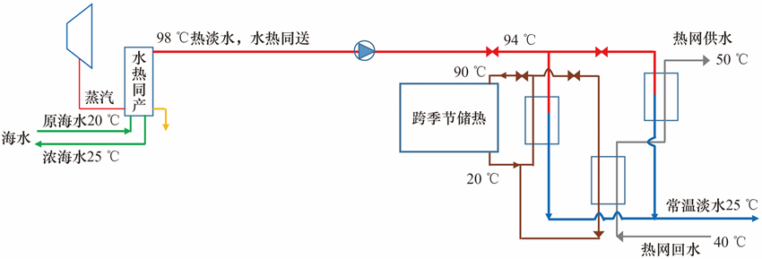 抽取核電低壓蒸汽作為海水淡化的動(dòng)力,通過多級(jí)閃蒸方式制備95 ℃的熱淡水。輸入蒸汽熱量的10%~15%隨海水淡化后得到的濃海水排出,85%~90%的熱量進(jìn)入熱淡水。當(dāng)取出的原海水溫度為20 ℃、輸出的熱淡水溫度為95 ℃時(shí),提供1 t蒸汽只需要制備熱淡水6.8~7.2 t,遠(yuǎn)低于常規(guī)熱法海水淡化的制水比(12~16)。熱法海水淡化裝置相對(duì)簡(jiǎn)單,允許有較大的換熱溫差,可降低海水淡化裝備的投資。在非采暖季,熱淡水送至用熱用水末端,與跨季節(jié)儲(chǔ)熱設(shè)施的循環(huán)水換熱,得到常溫淡水用于生活給水;換熱釋放出的熱量進(jìn)入跨季節(jié)儲(chǔ)熱設(shè)施。在采暖季,熱淡水直接與城市熱網(wǎng)循環(huán)水換熱,冷卻至常溫后進(jìn)入生活用水;進(jìn)入寒冷期,增大熱網(wǎng)循環(huán)水流量,部分循環(huán)水與跨季節(jié)儲(chǔ)熱設(shè)施的循環(huán)水換熱,為供暖提供更多的熱量。