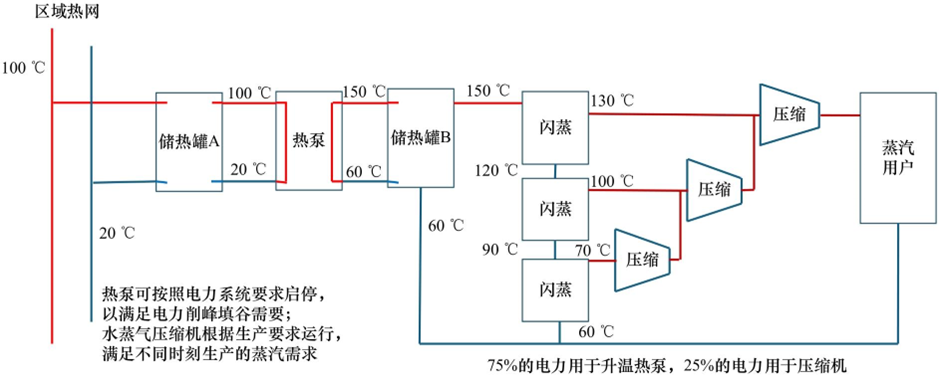 通過熱泵提取余熱共享系統(tǒng)輸送的低品位熱量,制備工業(yè)生產(chǎn)用蒸汽;優(yōu)化閃蒸出的低壓蒸汽壓力,使熱泵用電功率與蒸汽壓縮機(jī)用電功率之比>3??梢栽O(shè)置高溫水罐儲(chǔ)存熱泵制備出的高溫?zé)崴?,使熱泵運(yùn)行與蒸汽壓縮機(jī)的運(yùn)行解耦。當(dāng)風(fēng)光電力大發(fā)時(shí),大功率運(yùn)行電動(dòng)熱泵消耗多出的電力,制備的高溫?zé)崴畠?chǔ)存于高溫儲(chǔ)水箱;當(dāng)風(fēng)光電力減少、終端仍然需要蒸汽時(shí),直接取高溫儲(chǔ)水箱的熱水,再通過閃蒸和蒸汽壓縮制備蒸汽(見圖5)。