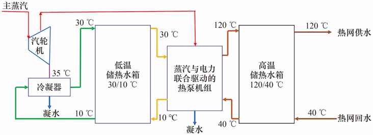 北方地區(qū)目前普遍應(yīng)用的方式是:在冬季負(fù)荷高峰期全功率發(fā)電,而在負(fù)荷低谷期最大能力地抽汽供熱,通過電鍋爐方式將部分電力轉(zhuǎn)為熱量,進(jìn)一步減少輸出的電力;抽汽獲得的熱量、電鍋爐制備的熱量在滿足當(dāng)時(shí)的供熱需求外儲(chǔ)存在儲(chǔ)熱水罐,作為電力負(fù)荷高峰期的供熱熱源。這一方式使高品位電力轉(zhuǎn)為低品位熱量,造成能量品位的損失,冷凝器排出的冷端余熱也不能有效回收利用,系統(tǒng)的能源轉(zhuǎn)換效率、發(fā)電效率都不高。