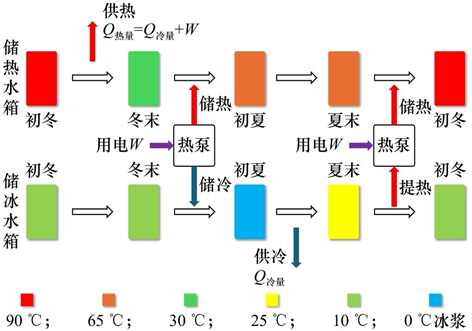 跨季節(jié)儲(chǔ)熱/儲(chǔ)冷原理討論如下。進(jìn)入冬季,利用蓄熱水箱預(yù)先儲(chǔ)存的90 ℃熱水為建筑供熱,釋放出熱量后成為30 ℃溫水并儲(chǔ)存;采暖結(jié)束后,利用春季的過剩電力將儲(chǔ)冷水箱中15 ℃的冷水制成冰漿,用制冰提取出的熱量加熱蓄熱水箱中的溫水。春季結(jié)束時(shí),儲(chǔ)冷水箱中為含冰量30%~50%的冰漿,儲(chǔ)熱水箱的水溫升至65 ℃。進(jìn)入夏季,利用儲(chǔ)冷水箱中的冰漿為建筑供冷,釋出冷量后成為25 ℃的溫水。進(jìn)入秋季,再利用富余的電力通過熱泵將冷水箱中25 ℃的溫水冷卻到10 ℃,提取出的熱量將熱水箱中的熱水由65 ℃升溫至90 ℃。由此實(shí)現(xiàn)利用春、秋季的富余電力,將夏季建筑物排出的熱量用于冬季采暖,既可減少冬、夏季采暖空調(diào)的用電量,也能解決冬季建筑采暖缺少熱源的問題。通過這一方式全年獲取的冷/熱量之和與用電總量之比可達(dá)5,即使考慮儲(chǔ)熱、儲(chǔ)冷損失,綜合COP>4,優(yōu)于單獨(dú)的熱泵制熱、制冷表現(xiàn)。