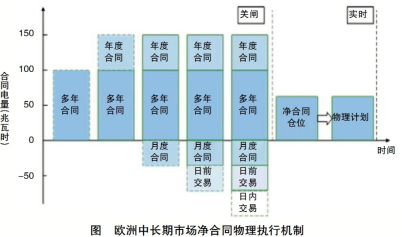 從物理執(zhí)行的角度,電力市場只有現(xiàn)貨市場,沒有中長期市場;中長期市場只是服務(wù)于電力現(xiàn)貨市場價格風險管理的配套市場。由于這個原因,國外電力市場一般就是指現(xiàn)貨市場。美國電力市場主要是日前市場和實時市場,專門用于現(xiàn)貨市場價格風險管理的電力金融市場完全由專門金融機構(gòu)組織,不納入電力市場范圍。歐洲統(tǒng)一電力市場雖然有中長期市場,甚至統(tǒng)計的交易電量規(guī)模或比例比較大,但是這個市場其實主要也是金融性的,即用于市場經(jīng)營主體通過套利機制規(guī)避現(xiàn)貨市場價格風險,而不是物理執(zhí)行。如圖所示,在歐洲統(tǒng)一電力市場中,市場經(jīng)營主體可開展多年、年度、月度中長期交易合同,中長期合同與日前合同、日內(nèi)合同形成的凈合同才物理執(zhí)行。表面上看好像與目前我國電力市場相似,實際上,由于市場經(jīng)營主體可以超過發(fā)用電能力和反向申報(即發(fā)電企業(yè)可申報用電合同等),歐洲中長期市場具有非常明顯的金融性,即通過不同周期、不同地區(qū)和不同市場體系之間的套利機制,使各種市場的交易價格趨于一致,市場經(jīng)營主體規(guī)避了價格風險。