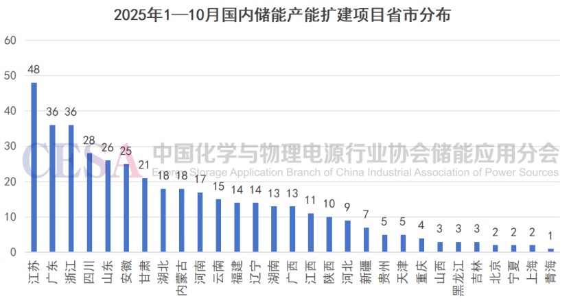 如果將視角下沉到省級層面,江蘇省以48個項目遙遙領(lǐng)先全國,蘇州、無錫等制造業(yè)重鎮(zhèn)無疑是其項目的主要承載地。廣東和浙江則以36個項目并列第二。廣東的項目多集中在深圳、惠州等珠三角城市,重點在于鋰電池產(chǎn)業(yè)鏈的進一步延伸;而浙江的項目則主要分布在杭州、寧波,充分依托其活躍的民營經(jīng)濟來推動儲能技術(shù)的商業(yè)化應(yīng)用。