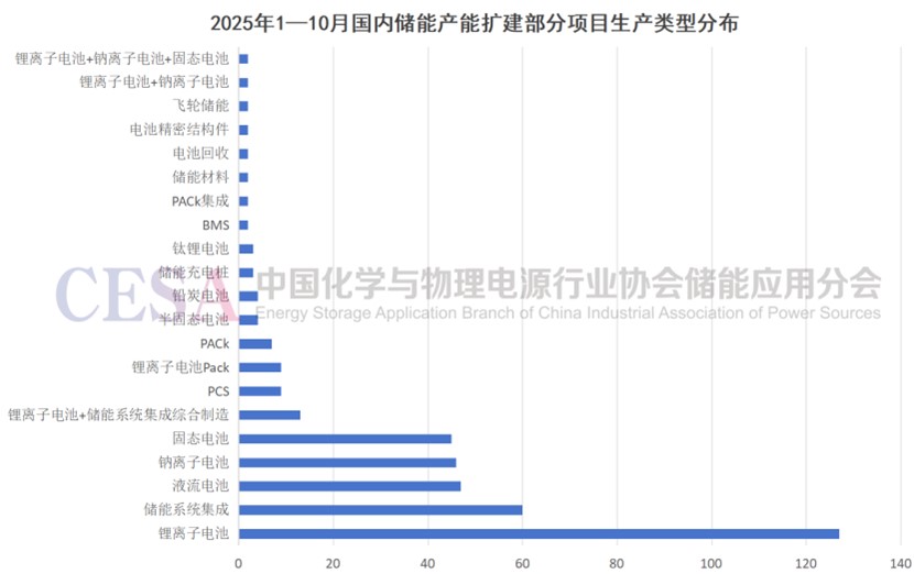 在擴建項目的生產(chǎn)類型上,鋰離子電池無疑是絕對的主力,以127個項目高居榜首。這不難理解,畢竟它在動力電池、電網(wǎng)儲能以及消費電子等領(lǐng)域的成熟應(yīng)用和廣泛市場認可,使其成為當前儲能技術(shù)路線的絕對主導(dǎo)。