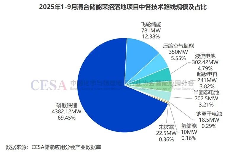 招投標(biāo)市場中,據(jù)CESA儲能應(yīng)用分會數(shù)據(jù)庫不完全統(tǒng)計,1-9月,混合儲能項目的招投標(biāo)規(guī)模達(dá)到了6.31GW/14.7GWh,分別占總功率和總?cè)萘康?.07%和4.58%。