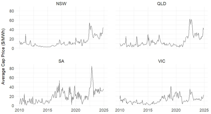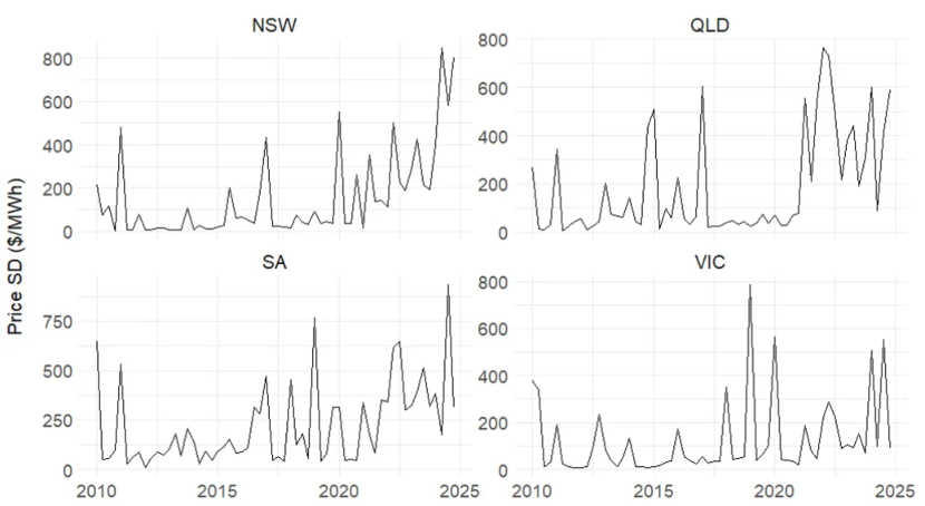 其一,電力市場波動(dòng)性正在加劇。一方面,價(jià)格上限大幅提升,從2010年的10,000美元/兆瓦時(shí)升至2025年的20,300美元/兆瓦時(shí)。同時(shí),價(jià)格觸及上限頻率明顯增加。2018年前各州電價(jià)全年未觸頂,近年卻已成為常態(tài)。另一方面,電價(jià)波動(dòng)幅度持續(xù)擴(kuò)大。除極端事件外,近年電價(jià)的季度標(biāo)準(zhǔn)差也普遍高于2018年前水平。圖1顯示,南澳大利亞州(SA)電價(jià)標(biāo)準(zhǔn)差在四個(gè)地區(qū)中最高,峰值超過750 $/MWh,波動(dòng)最為劇烈。