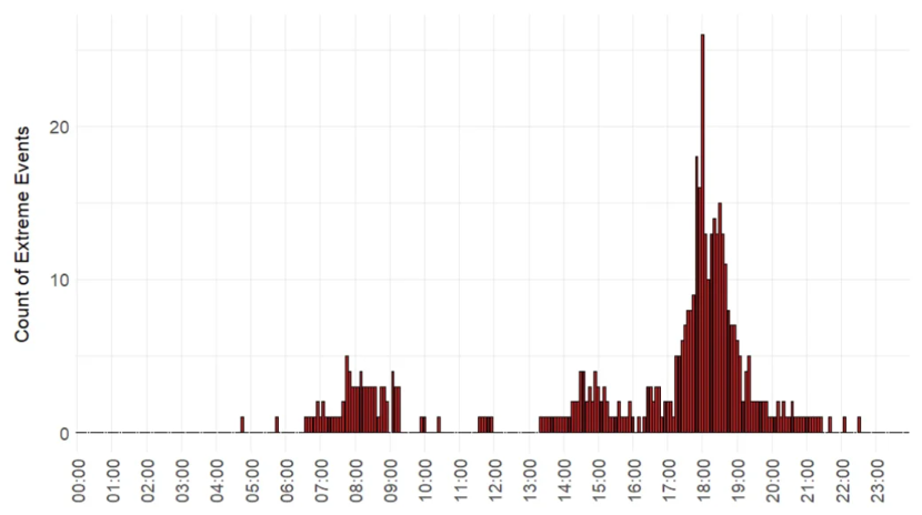 此外,波動(dòng)發(fā)生時(shí)段更難預(yù)測。以往波動(dòng)集中于傍晚高峰,如今已擴(kuò)展至全天隨機(jī)發(fā)生。2024年更是出現(xiàn)下午2至3點(diǎn)的新聚集時(shí)段。圖2表明,當(dāng)年極端價(jià)格事件在16:00至18:00達(dá)到峰值。這種變化加大零售商的對沖需求與成本。