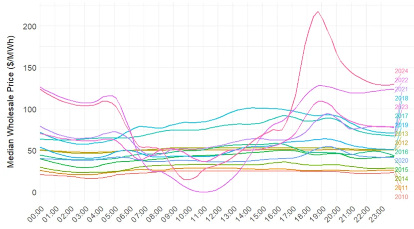 其三,鴨形曲線正在加劇。太陽能發(fā)電在電網(wǎng)中的滲透率提升正改變電價(jià)與需求特征。由于太陽能發(fā)電集中于中午,無法匹配傍晚高峰需求,導(dǎo)致白天電力供應(yīng)過剩、價(jià)格趨近于零甚至為負(fù)。而在傍晚需求激增時(shí)段,剩余發(fā)電機(jī)被推高價(jià)格。如圖4所示,各年份電價(jià)曲線均呈現(xiàn)典型鴨形結(jié)構(gòu)。電價(jià)在清晨與深夜較低,白天整體較高,并于19:00至20:00形成顯著尖峰。2021年與2024年該峰值尤為突出。這種曲線使每日成本嚴(yán)重偏向傍晚高峰時(shí)段,推高整體供電成本。為應(yīng)對此類結(jié)構(gòu)變化,零售商需采用更復(fù)雜的需求形態(tài)或負(fù)荷跟蹤對沖工具,從而增加風(fēng)險(xiǎn)管理的復(fù)雜性與成本。