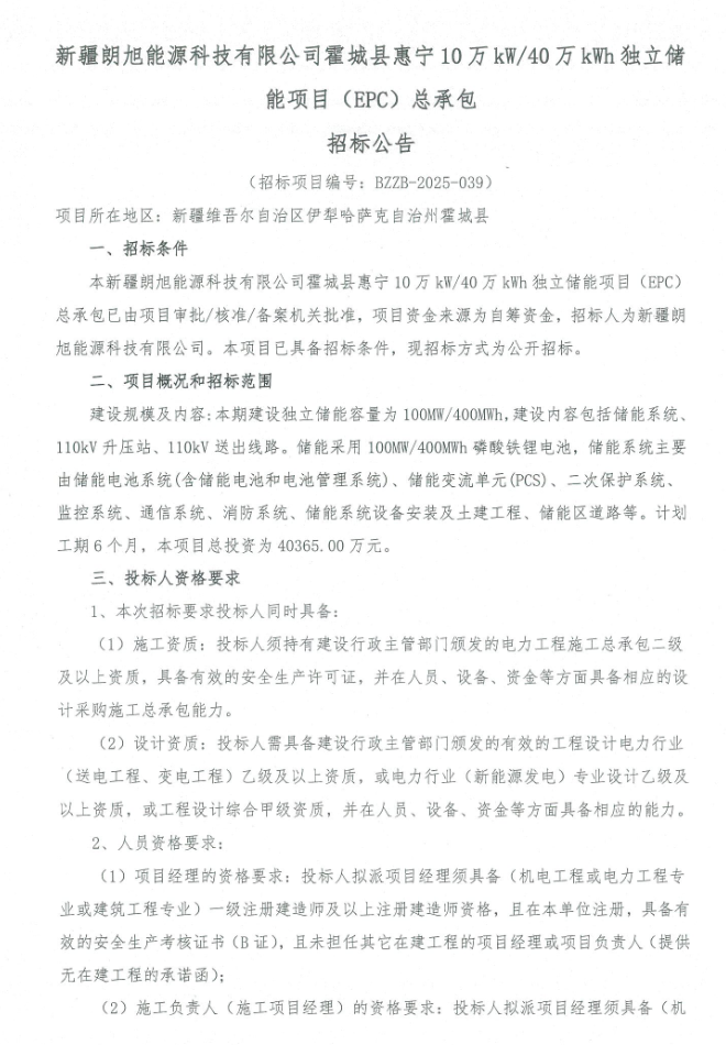 中國(guó)儲(chǔ)能網(wǎng)訊:11月21日,新疆朗旭能源科技有限公司霍城縣惠寧10萬(wàn)kW/40萬(wàn)kWh獨(dú)立儲(chǔ)能項(xiàng)目(EPC)總承包招標(biāo)公告發(fā)布,項(xiàng)目招標(biāo)人為新疆朗旭能源科技有限公司,項(xiàng)目位于新疆維吾爾自治區(qū)伊犁哈薩克自治州霍城縣,本期建設(shè)獨(dú)立儲(chǔ)能容量為100MW/400MWh,建設(shè)內(nèi)容包括儲(chǔ)能系統(tǒng)110kV 升壓站、110kV 送出線路。