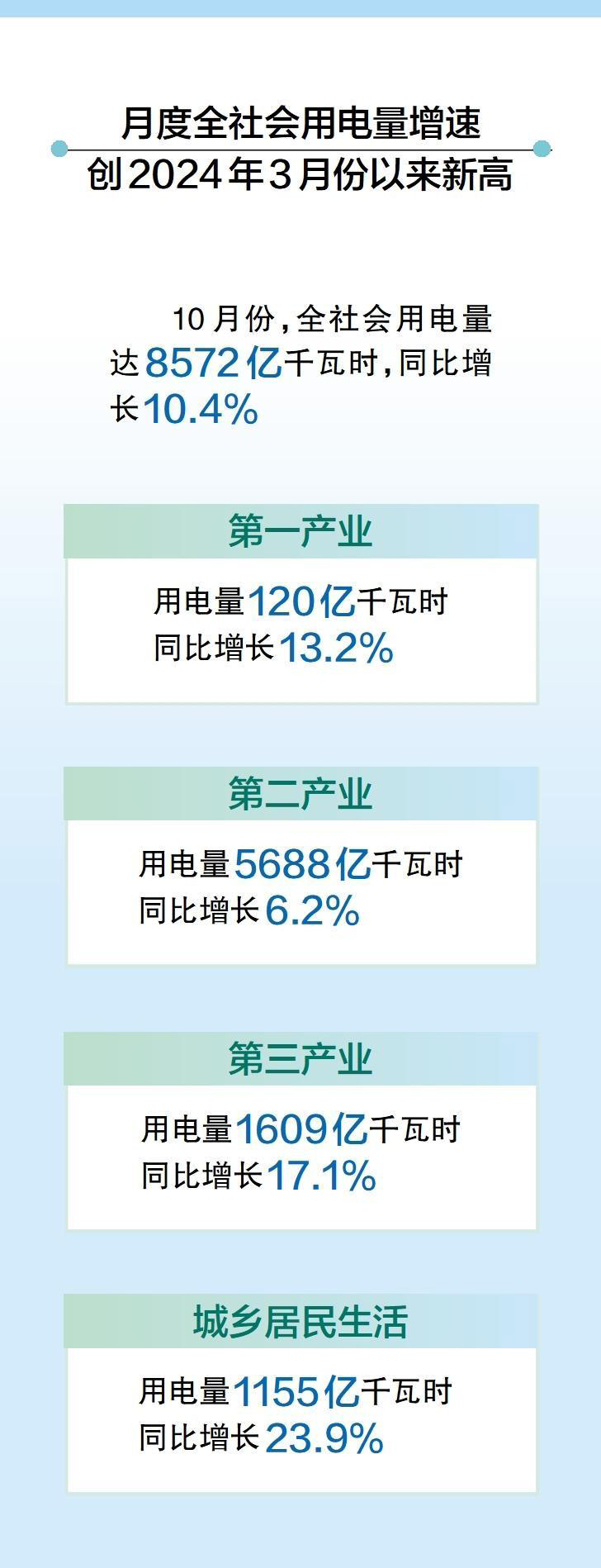 從電力消費(fèi)看,10月份,全社會(huì)用電量達(dá)8572億千瓦時(shí),同比增速達(dá)10.4%。國網(wǎng)能源研究院經(jīng)濟(jì)與能源供需研究所專家張莉莉介紹,這一增速創(chuàng)下2024年3月份以來月度全社會(huì)用電量增速新高。分產(chǎn)業(yè)看,10月份第一產(chǎn)業(yè)用電量為120億千瓦時(shí),同比增長13.2%;第二產(chǎn)業(yè)用電量為5688億千瓦時(shí),同比增長6.2%;第三產(chǎn)業(yè)用電量達(dá)1609億千瓦時(shí),同比增長17.1%,其中,充換電服務(wù)業(yè)以及信息傳輸、軟件和信息技術(shù)服務(wù)業(yè)用電量增長較快;城鄉(xiāng)居民生活用電量達(dá)1155億千瓦時(shí),同比增長23.9%。