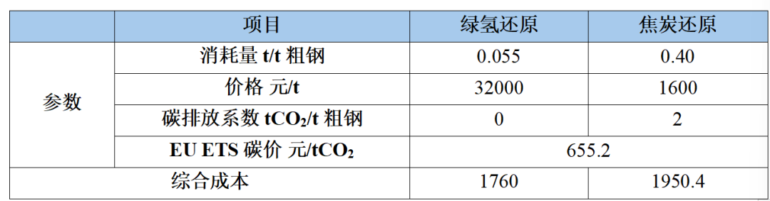 表2 焦炭冶煉與氫氣冶煉路線(xiàn)成本估算對(duì)比注:綠氫價(jià)格、EU ETS碳價(jià)參考公開(kāi)報(bào)道與國(guó)際市場(chǎng)價(jià)格;焦炭?jī)r(jià)格參考期貨價(jià)格