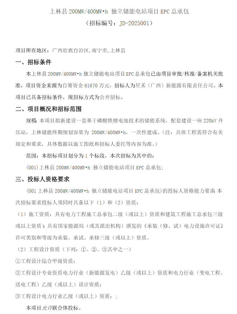 中國(guó)儲(chǔ)能網(wǎng)訊:2025年11月25日,星禾(廣西)新能源有限責(zé)任公司發(fā)布招標(biāo)公告,擬新建設(shè)一套基于磷酸鐵鋰電池技術(shù)的儲(chǔ)能系統(tǒng),配套建設(shè)一座220kV升壓站,上林儲(chǔ)能終期規(guī)劃容量為200MW/400Mh,一次性建成。資金來(lái)源為自籌資金61670萬(wàn)元,約合單價(jià)1.54元/Wh。項(xiàng)目地點(diǎn)為廣西南寧市上林縣。