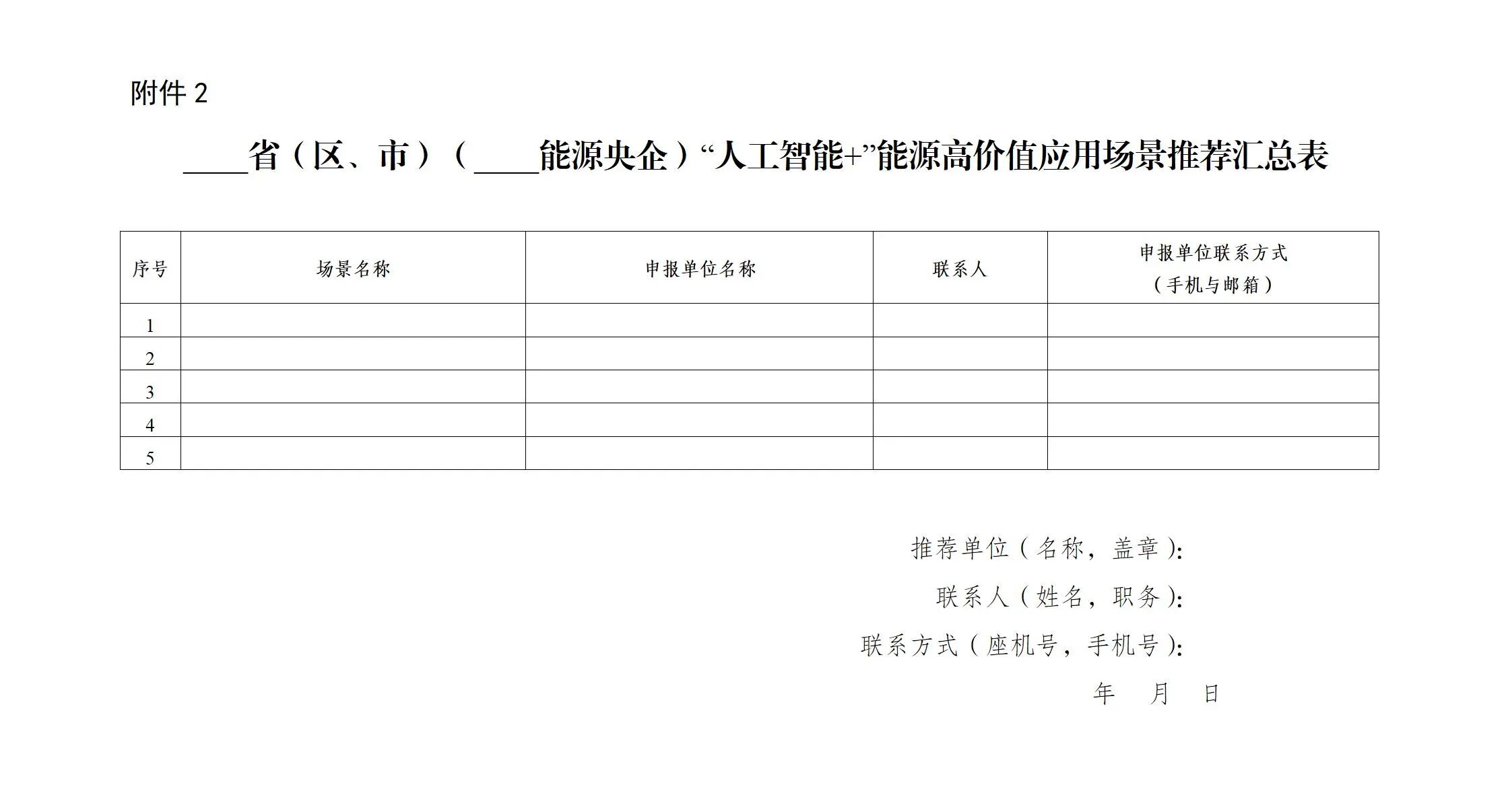 4.請各省級能源主管部門、中央企業(yè)于2025年12月29日前將高價值應(yīng)用場景申報書(詳見附件1)、推薦匯總表(詳見附件2)蓋章件一式三份紙質(zhì)版及電子版(光盤刻錄)寄送至國家能源局科技司。申報場景命名規(guī)則為“推薦地區(qū)/單位名稱-序號-場景名稱”(序號與推薦匯總表一致)。