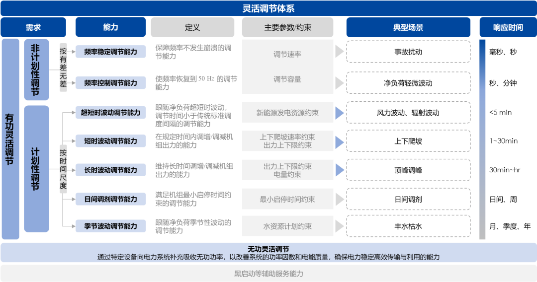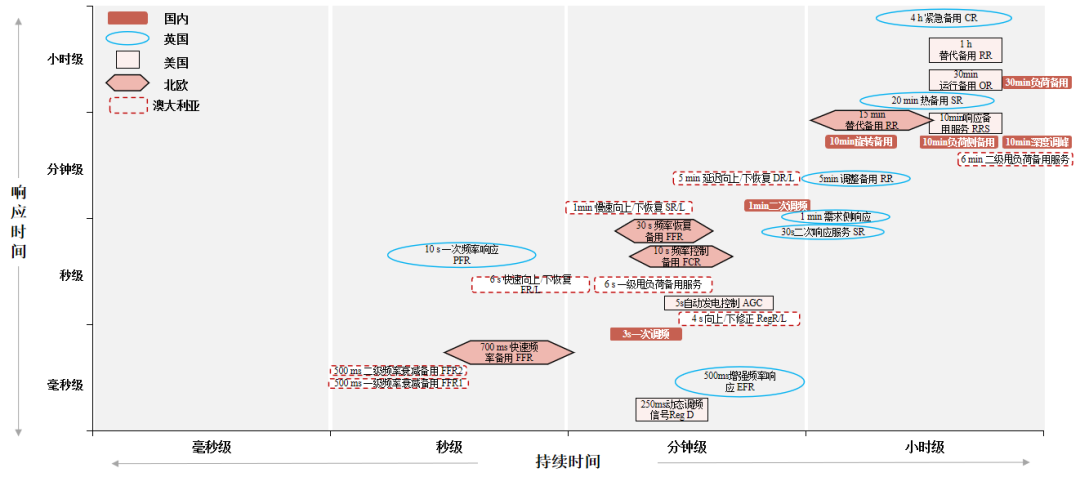 從國際經(jīng)驗看,歐美等國家的靈活調(diào)節(jié)體系更強調(diào)非計劃性調(diào)節(jié),在頻率控制調(diào)節(jié)能力、頻率恢復(fù)調(diào)節(jié)能力上,有更細(xì)致的分級與更開放的市場。同時,近年來持續(xù)細(xì)化顆粒度,新增了毫秒級響應(yīng)時間服務(wù)(美國的RegD、英國的EFR、北歐的FFR、澳大利亞的FFR1)。當(dāng)前,國內(nèi)進(jìn)入輔助服務(wù)市場交易的產(chǎn)品以調(diào)峰輔助服務(wù)居多,國外成熟電力市場體系中均未設(shè)置調(diào)峰輔助服務(wù),相關(guān)能力的價值通過在現(xiàn)貨主能量市場中解決;國內(nèi)外在超短時波動調(diào)節(jié)能力上,都存在較大空缺。隨著接入電網(wǎng)的可再生能源及電力電子裝備的比例日益增大,在超短時的時間尺度上的靈活調(diào)節(jié)充裕度或?qū)⑹艿教魬?zhàn)。各國靈活調(diào)節(jié)能力產(chǎn)品的性能要求如下圖所示。