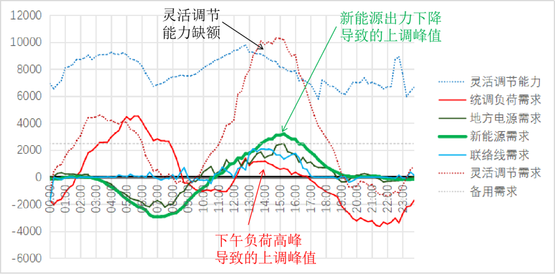 隨著新能源滲透率大幅提高,新能源出力的急劇上升會導(dǎo)致系統(tǒng)急需減小出力,產(chǎn)生下調(diào)需求峰值;而新能源出力的急劇下降則會導(dǎo)致系統(tǒng)急需加大出力,產(chǎn)生上調(diào)需求峰值。因此,對于光伏裝機容量較大的區(qū)域,新能源波動產(chǎn)生的調(diào)節(jié)需求峰值易與系統(tǒng)負(fù)荷曲線產(chǎn)生的調(diào)節(jié)峰值形成“峰上疊峰”。