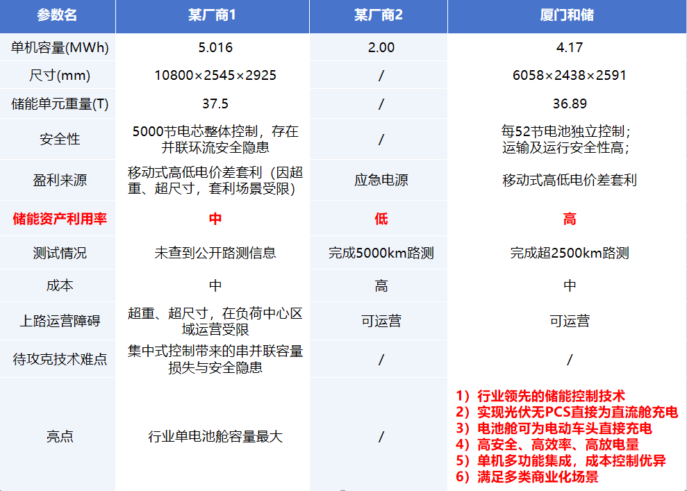 以下為廈門和儲移動儲能產(chǎn)品與同行主要產(chǎn)品的關鍵參數(shù)對比: