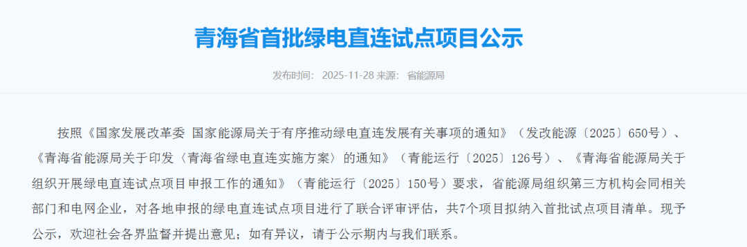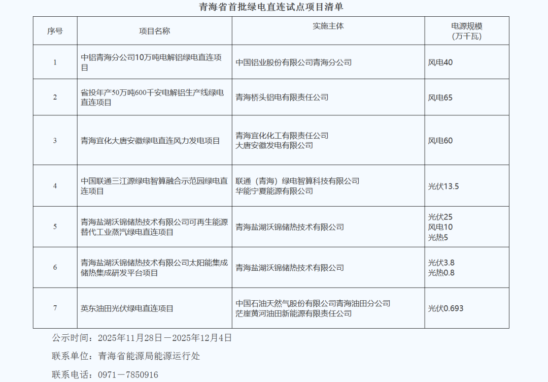 中國儲能網(wǎng)訊:11月28日,青海省發(fā)改委發(fā)布首批綠電直連試點(diǎn)項目公示。經(jīng)評審評估,共7個項目擬納入首批試點(diǎn)項目清單。項目類型包括電解鋁、智算融合、油田項目等,涉及裝機(jī)規(guī)模2237.93MW。其中,光伏裝機(jī)規(guī)模429.93MW,風(fēng)電裝機(jī)規(guī)模1750MW,光熱58MW。